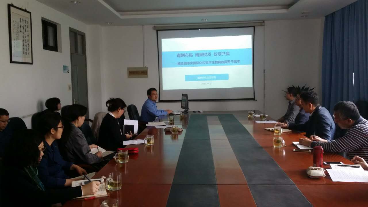 学生交换工作负责人赵嵌嵌汇报了学院近五年学生出国(境)进修和留学生培养工作的概况,并结合工作实际,提出完善交流生学分认定操作规范;增加对外交流项目,加大学生国际交流学习的机会;加大招生宣传力度,以专业特色,吸引留学生生源;针对留学生制定适宜的教学计划等建议。