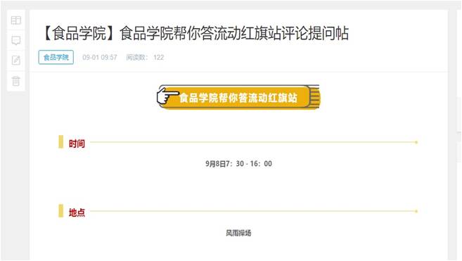 此外,为使新生更好地融入大学生活,食品学院借助易班新媒体也相继推出了“新生攻略”系列推送、“食品学院团委帮你答疑——红旗流动站”等活动。这让新生们在一定程度上了解了入学流程和大学的校园生活以及学习。应届各位新生的是崭新的环境、多彩的生活、丰富的活动、知识的盛宴。