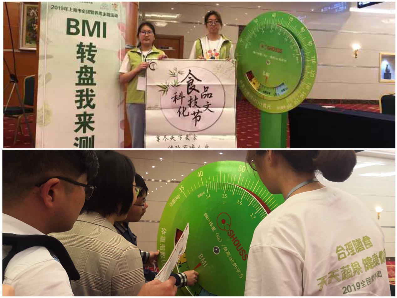 同一时间,在浦东国际会议中心举办的上海市全民营养周营养健康系列活动启动仪式上也出现了我院志愿者的身影。在活动现场,志愿者们主要的工作是对市民们进行BMI的测定与讲解。来往市民对BMI转盘表现出极大的兴趣,志愿者们通过有趣的介绍让大家很快就了解其中的科学原理,随后结合测定结果,她们现场向市民科普如何通过灵活的食品营养搭配调节自己的体重指数,从而达到更健康的身体素质。市民王女士开心地说:“以前只是了解食品营养搭配的皮毛,今天我才知道原来有这么多有趣的科学方法呀。”