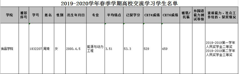根据教务处文件《关于选派2019-2020学年春季学期赴东京海洋大学交流学习的通知》,经个人申请,食品学院审议,共1位同学符合各项指标,特此公示。公示时间2019年10月17日-2019年10月21日。