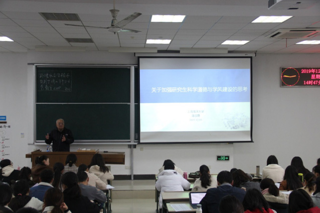 为提高研究生的学术道德自律意识,我校一直致力于加强研究生学术道德和学风建设。12月3日下午在教学楼2101,潘迎捷教授作了题为“关于加强研究生科学道德与学风建设的思考”的学术讲座。讲座由食品学院副院长宋益善老师主持,食品学院2019级全体研究生聆听了此次讲座。