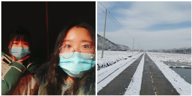 冬天的舒城寒风凛冽,伴着雪花落下的不再是欢声笑语,而是严肃紧张的防疫氛围。方蕾同学和来自华师大的师姐一同守在关口帐篷里,在检查过程中,她们要对所有进出人员测温、检查佩戴口罩情况,做到进口必拦,身份必问,体温必测,信息必登,外人必劝。尽管已到深夜,她们还常遇到想要偷偷经过的人,这些人调侃道:“你们这太严了,这么晚还让你们小孩来值班。”“不,我们不是小孩子,我们是党的后备军!是防疫战士!”她们回答道。