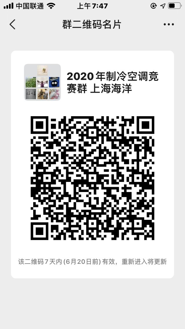 七、请各参赛队的每名成员加入微信群(2020年制冷空调竞赛群 上海海洋),关于竞赛的相关信息及问题解答将在此群发布和交流。