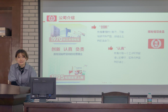 谢缘元学姐首先向同学们介绍了上海世达食品有限公司的理念以及一些公司产品,帮助同学们更深入地了解到桂冠火锅的同时也为同学们增添了创新灵感。然后还给同学们看了关于此次创新大赛的宣传片,并从大赛主旨、参赛要求、时间安排、奖金明细等方面详细地介绍了本次大赛的信息,也给同学们提出了一些参赛方面的指导,使得同学们更加清楚了本次大赛的详情。