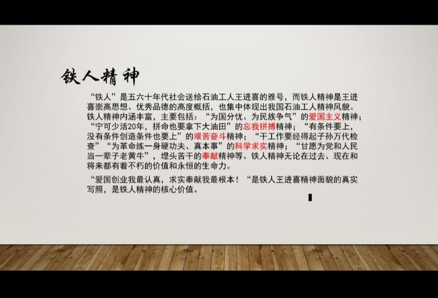 本次宣讲由班皇政给同学们介绍了王进喜先生的生平事迹。历者过也,史者事也。王进喜曾说:“一个人没有血液,心脏就停止跳动。工业没有石油,天上飞的,地上跑的,海上行的,都要瘫痪。没有石油,国家有压力,我们要自觉地替国家承担这个压力,这是我们石油工人的责任啊!”王进喜是中国黑龙江省大庆市大庆油田石油工人,他曾率队从玉门到大庆参加石油大会战,发扬“为国分忧,为民族争气”的爱国主义精神,为结束“洋油”时代而顽强拼搏。因王进喜用自己的身体制伏井喷,故人称“铁人”。在他的率领下,1205钻井队艰苦创业,打出了大庆油田石油大会战第一口油井,并创造了年进尺10万米的世界钻井纪录,展现了大庆石油工人的气概,为中国石油工业的发展作出了重要贡献,成为中国工业战线的一面旗帜。