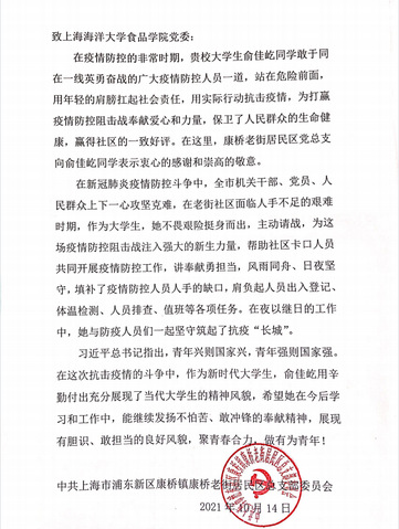 近日,Kaiyun官方网站登录入口党委收到了浦东新区康桥镇康桥老街居委会发来的一封感谢信。信中对食品学院本科生第三党支部的学生党员俞佳屹敢于挺身在疫情防控一线表示衷心的感谢和崇高的敬意。