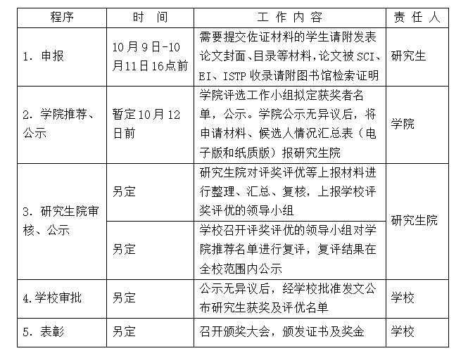 1.研究生国家奖学金:提交《研究生国家奖学金申请审批表》(正反双面打印,一式两份)和《高校研究生国家奖学金专家推荐信表格》(一式一份;博士研究生须提交2封同行专家推荐信,其中1封由境外高校专家撰写;硕士研究生须提交1封校外专家推荐信。撰写推荐信的专家必须具有正高职称,对申请者的研究领域要有较深入的了解)以及评奖佐证材料(一式一份)。
