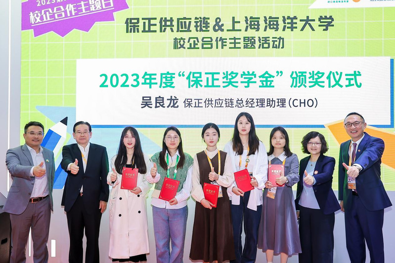 在今年6月,保正向我校捐赠了奖学金及奖教金,希望以此次捐赠为契机,以实际行动践行保正“传递正能量”的理念精神。至今,上海海洋大学已经评选出第一批获得“保正奖学金”的优秀学子,因此,本次活动现场还进行了2023年度“保正奖学金”颁奖仪式,向获得2023年度“保正奖学金”的6位同学颁发获奖证书。李兰心同学作为获奖同学代表上台发言,既表达了对保正供应链设立奖学金的感谢,又代表学生们表明了努力学习、钻研食品领域的决心。