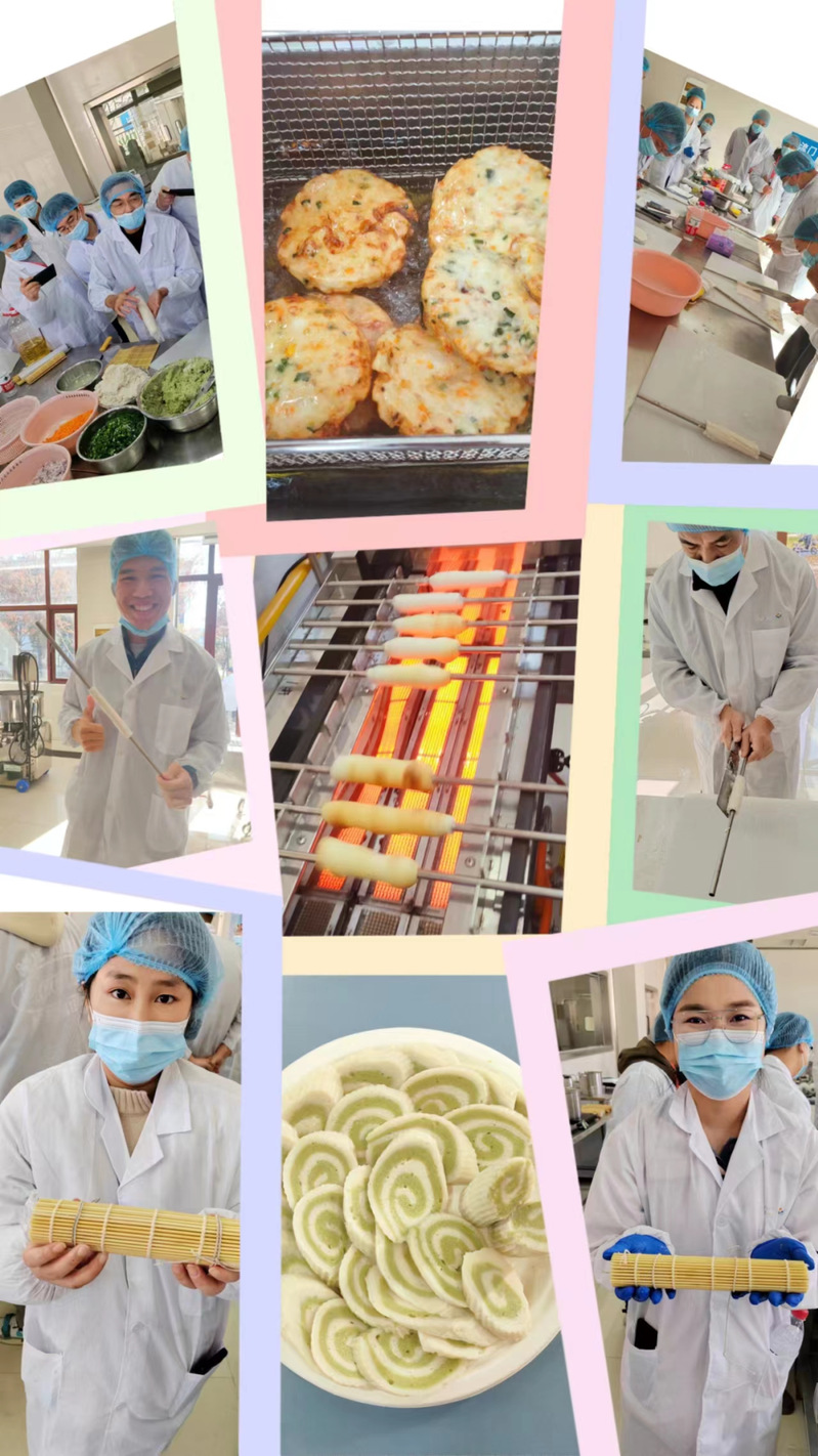 实训环节上,俞骏老师对食品工厂布局及卫生要求进行了讲解,分享了“冷冻鱼糜及鱼糜制品的产业化设计”课程内容,并对虾滑和鱼丸进行了工艺流程介绍与实操演示;蔡森元老师对鱼饼、鱼竹轮和鸣门卷等产品进行了工艺流程介绍与实操演示,学员们随后进行了鱼竹轮、鸣门卷、虾滑等产品的实操训练。