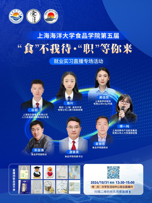 “直播带岗”搭梯,“云上服务”架桥,为助力2025届毕业生高质量充分就业,食品学院于10月31日召开第五届“食”不我待·“职”等你来——就业实习直播专场活动。食品学院党委书记游录泉、副院长金银哲、副院长宋益善出席,上海田野农产品配送集团有限公司都创(上海)医药开发有限公司上海冠生园食品有限公司、上海来伊份股份有限公司四家企业用人单位代表受邀参与。直播由2025届本科生毕业生窦肖博和2023级研究生陈颖珂共同主持。