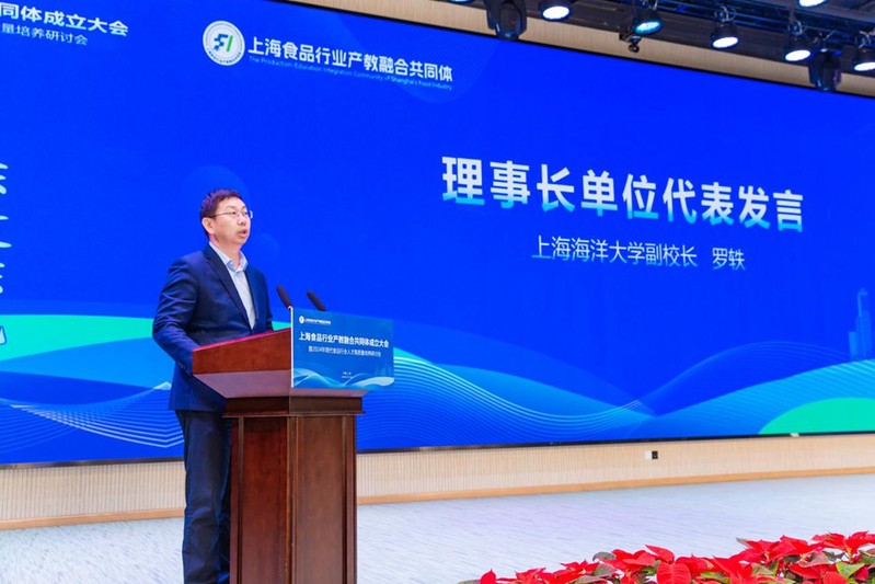 2024年12月12日,一场标志着上海食品行业产教融合新篇章的盛会隆重举行——上海食品行业产教融合共同体成立大会。此次大会汇聚了光明食品(集团)有限公司、上海海洋大学、上海市质量监督检验技术研究院和上海食品科技学校等多方力量,共同擘画产教融合新蓝图。上海海洋大学副校长罗轶与食品学院副院长宋益善代表学校出席了此次盛会。