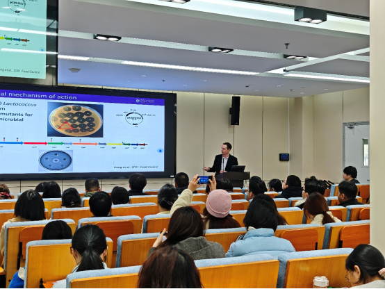 下午13:00,Mark Turner教授在食品学院A106报告厅作题为“乳酸菌的生物发掘:面向食品安全、腐败控制与发酵的应用”的专题讲座。Mark Turner教授系统介绍了昆士兰大学的概况以及其团队利用全基因组测序从果蔬与禽肉中分离、筛选乳酸菌(LAB)的最新进展,重点展示了LAB在抑制即食食品中的单增李斯特菌、控制奶酪霉菌腐败以及提升植物基乳制品酸化与质构等方面的应用案例,并分享了昆士兰大学“食品与饮料加速器”(FaBA)在精准发酵与产业转化方面的经验。报告现场互动热烈,师生就国际学习交流、LAB在水产品中的应用等问题与Mark Turner教授展开深入讨论。