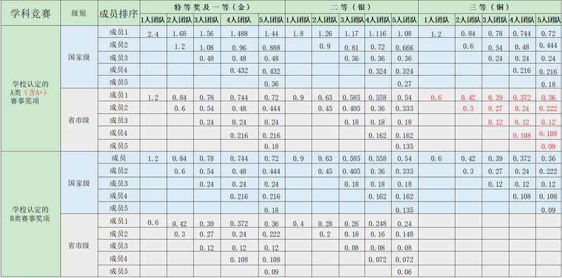 ①获得学校认定的A(含A+)、B赛事奖励,每项最高计为2.4绩点,计前5名。其中A+类赛事获区域(省市)赛三等奖及以上给予加分;其他赛事获区域(省市)赛二等奖及以上给予加分。