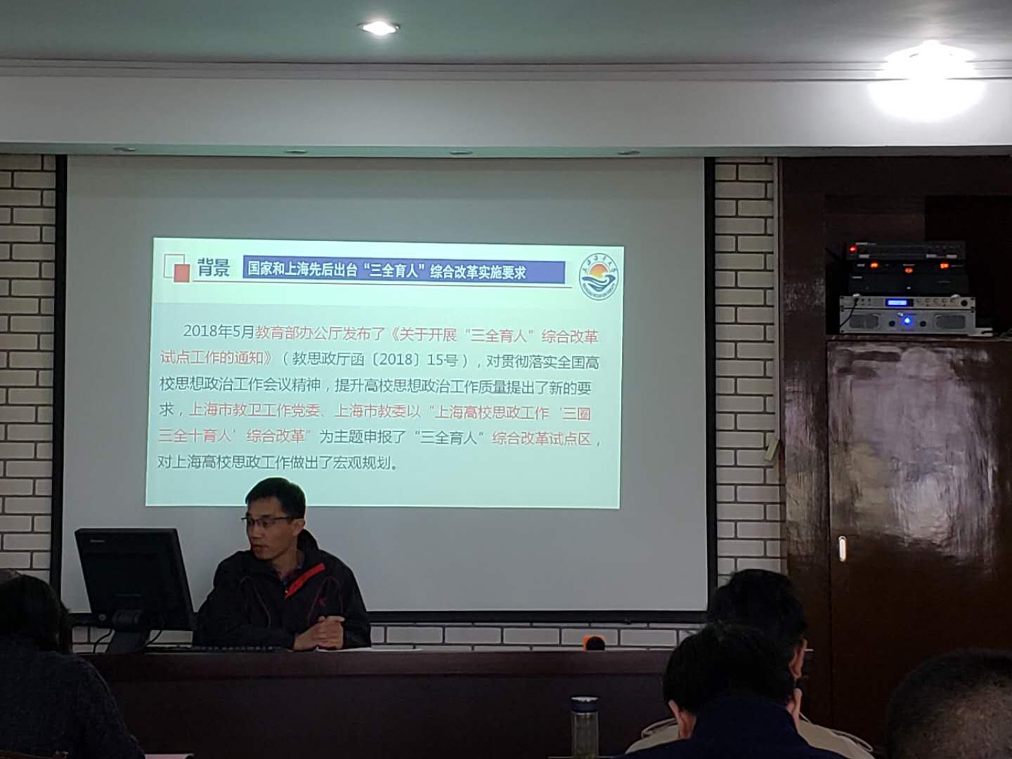 孙红刚结合全国高校思想政治会议工作精神,解读了上海市教卫工作党委、上海市教委“三圈三全十育人”综合改革的具体措施和宏观规划。孙红刚副书记指出在当前全国高校思想政治会议工作精神的指导与“双一流”高校建设的时代背景下,我们应认真对标全国和上海高校思政工作“三全育人”综合改革要求,牢牢把握2019年上海市教育委员会工作要点,做好新形势下宣传思想工作,形成全员全过程全方位育人格局,切实提高工作亲和力和针对性,着力培养德智体美劳全面发展的社会主义建设者和接班人,着力培养担当民族复兴大任的时代新人。