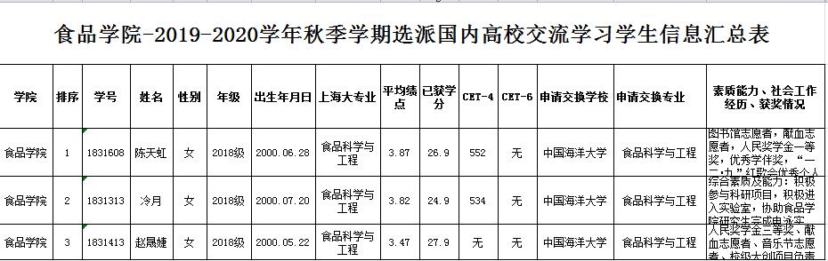根据教务处文件《关于2019-2020学年秋季学期选派学生赴国内海洋类高校交流学习的通知》,经个人申请,食品学院审议,共3位同学申报中国海洋大学且符合各项指标,学院根据教务处文件《赴境内外交流学生折算分计算表》(见附件)进行核算、排序。特此公示。公示时间2019年5月13日-2019年5月16日。