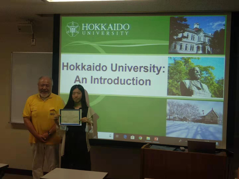 荒井教授与游学学员代表颁发证书合影 | 北海道大学荒井教授颁发游学实践证明合影 |
