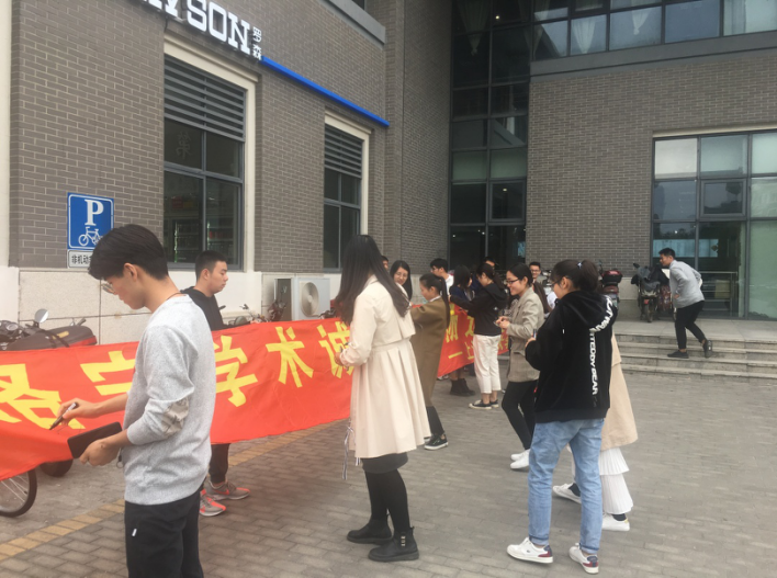 中午12点左右,主题活动接近尾声,茜丽尔老师与参加活动的同学们合影留念,并将宣传横幅悬挂在食品学院附近醒目的地方,以示提醒同学们恪守承诺。本次主题活动中,各学院近百名学生在学术道德宣传横幅上签下姓名。同学们纷纷表示,活动不仅有利于营造良好的学术环境,还有利于拓宽研究生的知识范围,更有利于提高研究生的综合素质。