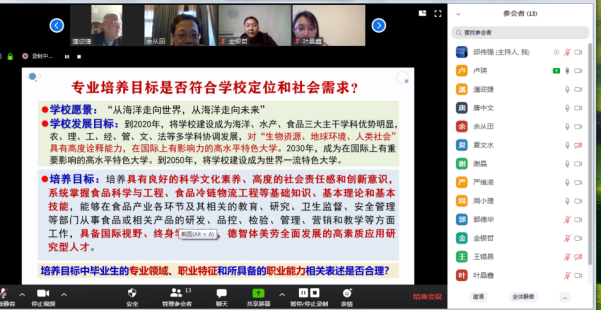 为推动食品科学与工程国家级一流本科专业建设,形成“以学生为中心、以成果为导向”的OBE教育理念的一流人才培养方案和一流专业建设内容,4月11日下午,食品学院通过ZOOM视频会议召开了“食品科学与工程国家级一流本科专业建设规划”工作会议,对专业建设规划方案进行研究讨论。教育部高等学校食品科学与工程类专业教学指导委员会、江南大学夏文水教授、我校原校长、上海市食品学会理事长潘迎捷教授、上海市农业农村委员会渔业管理处唐中文二级调研员、上海应用技术大学周小理教授、光明食品集团有限公司产业发展部副总经理余从田、上海市食品研究所副所长严维凌、上海海关动植物与食品检验检疫技术中心副主任郭德华、上海海洋大学研究生院执行院长王锡昌、Kaiyun官方网站登录入口院长谢晶、副院长金银哲以及食品科学与工程专业执行负责人卢瑛等参加了会议,由上海市食品学会理事长潘迎捷主持会议。