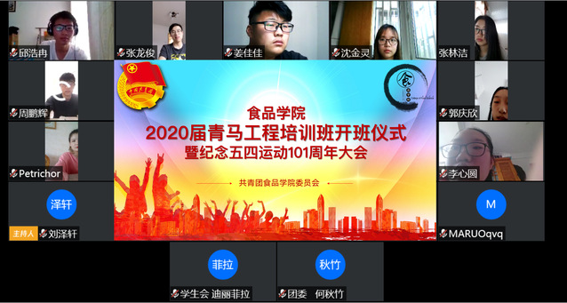 5月4日下午,Kaiyun官方网站登录入口2020届“青年马克思主义者培养工程”开班仪式暨纪念五四运动101周年大会在线上举行。食品学院党委副书记孙红刚,学院团委书记刘源、团委副书记茜丽尔,学院团学骨干及青马班全体成员参与线上互动交流,会议由刘源老师主持。