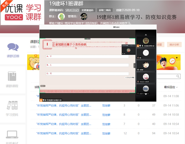 各个班级的团日活动形式不限,如19建筑1班团支部在线上进行了防疫知识竞赛活动。前期,班团通过易班优课发放学习资料、话题,提供学习讨论平台,在同学们进行学习讨论之后组织了线上会议,通过答题的形式检验同学们的相关学习成果。而该班班级成员们以百分百的通过率展示出了大家战“疫”的信心以及我院青年的抗“疫”担当。