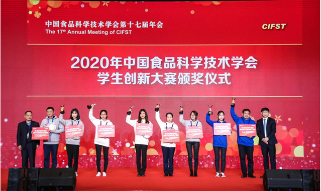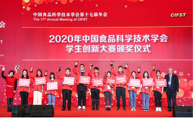 在本次年会上,中国食品科学技术学会还给第七届杜邦营养与生物科技两岸学生创新竞赛获奖团队颁奖。首届创新竞赛于2013年开始,迄今已成功举办6届。赛事由中国食品科学技术学会、台湾食品工业发展研究所、台湾食品科学技术学会、杜邦营养与健康共同主办。比赛包含初赛和复赛两个阶段,经限额推荐、初赛评审,共有43份计划书入围复赛。经过组委会组织业界权威专家和专业媒体代表对入围作品严格评审,最终评选出一等奖1名,二等奖2名,三等奖5名和最佳创意奖3名、优秀组织奖2名。我校由李慧、陈百科、金素莱曼、吴桐同学申报,包海蓉老师指导的作品“肽之吻-胶原蛋白果冻”荣获第七届杜邦营养与生物科技两岸学生创新竞赛二等奖。