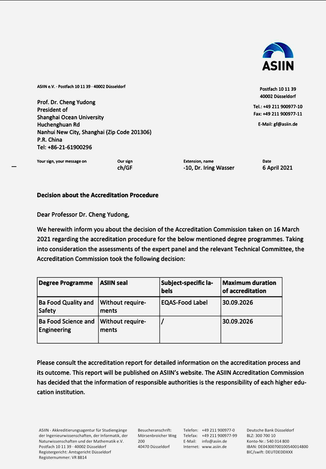 近日,欧洲ASIIN本科工程认证机构正式通知我校食品科学与工程及食品质量与安全专业圆满通过认证并获得ASIIN认证标签,其中食品质量与安全专业同时获得EQAS食品标签。