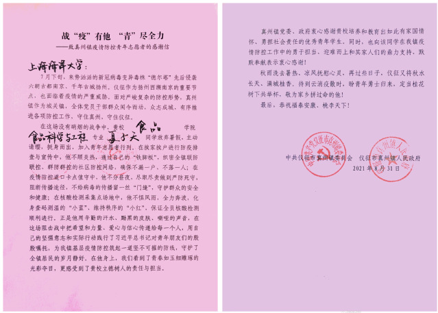 8月6日,处在新冠肺炎疫情爆发期的江苏省扬州市备受社会关注,据江苏省卫健委8月6日最新披露的消息,8月5日0-24时,江苏新增本土确诊病例61例,其中扬州市报告58例,扬州累计报告确诊病例220例。各个社区非常需要志愿者来帮助进行各种防疫工作,来自食品学院19食科3班的夏子天主动请缨,积极加入社区志愿服务团队的行列,穿上白色“战甲”,成为了一名防疫志愿者。他不怕苦、不怕累,斗志昂扬的奋战在抗疫一线,诠释了青年人有责任、敢担当、能奉献的精神,展现了新青年的时代风采,他的努力与付出得到了当地政府的嘉奖,为他送来了一封感谢信,这也为上海海洋大学增添了荣耀。
