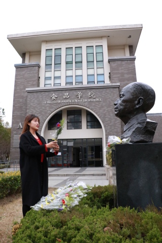 活动开始前全体师生对骆肇荛老院长鞠躬致敬,接着由师生代表为骆肇荛铜像除尘,清理周围环境。在场师生们认真地擦拭铜像,用点点滴滴的真情深切缅怀骆肇荛老院长,用不忘食品人初心的行动告慰先辈们。最后,师生代表们依次向骆肇荛老院长敬奉鲜花,以表追思。