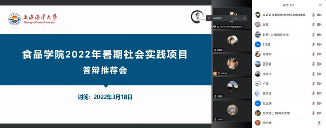 为深入学习贯彻习近平新时代中国特色社会主义思想,以建团100周年和上海海洋大学110周年校庆为契机,助力广大青年学生上好与现实相结合的“大思政课”,食品学院响应号召积极开展2022年大学生暑期社会实践活动。受疫情影响,大部分教师无法直接与学生面对面指导,于是学院在3月18日下午线上召开了2022年暑期社会实践项目答辩推荐会。食品学院院长谢晶,副院长赵勇、金银哲及各教研室主任、专业负责人、辅导员等十余位教师作为评委出席本次答辩会。